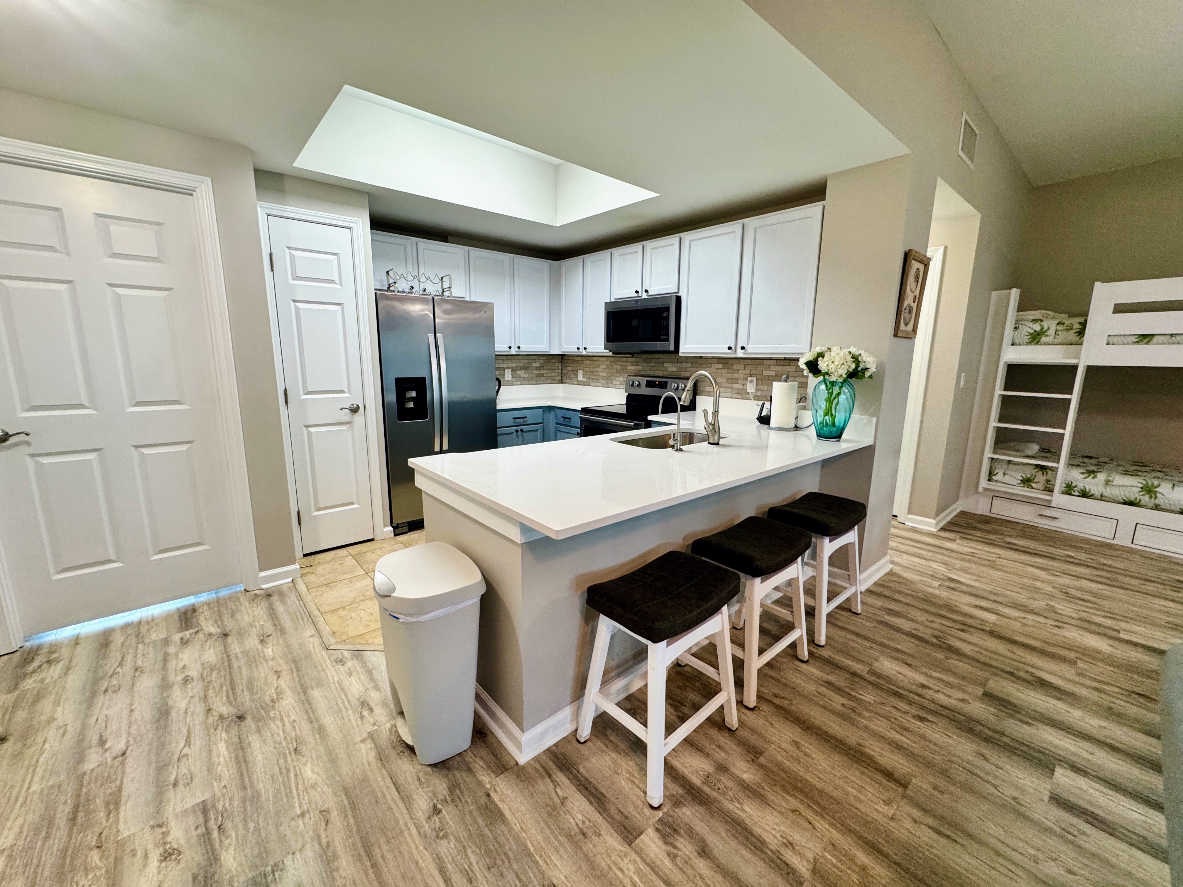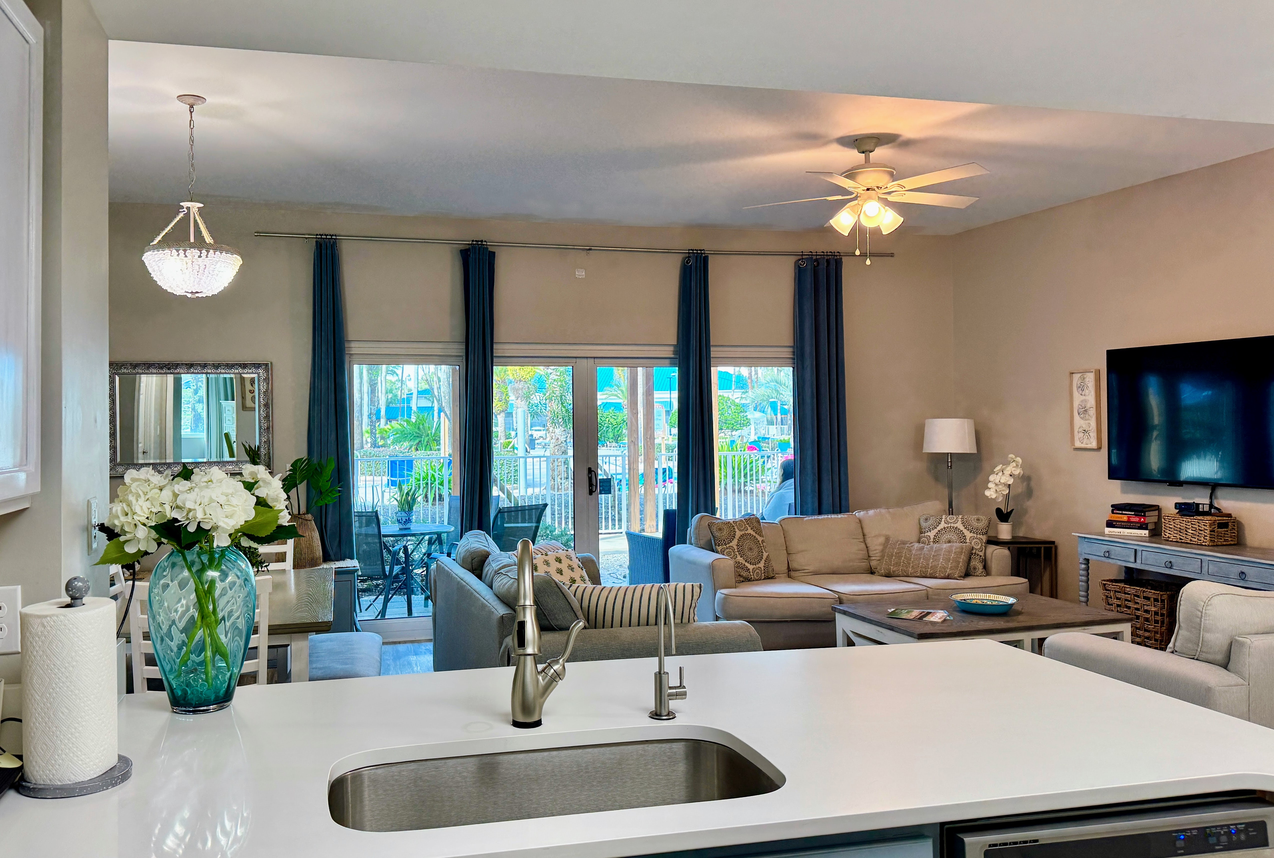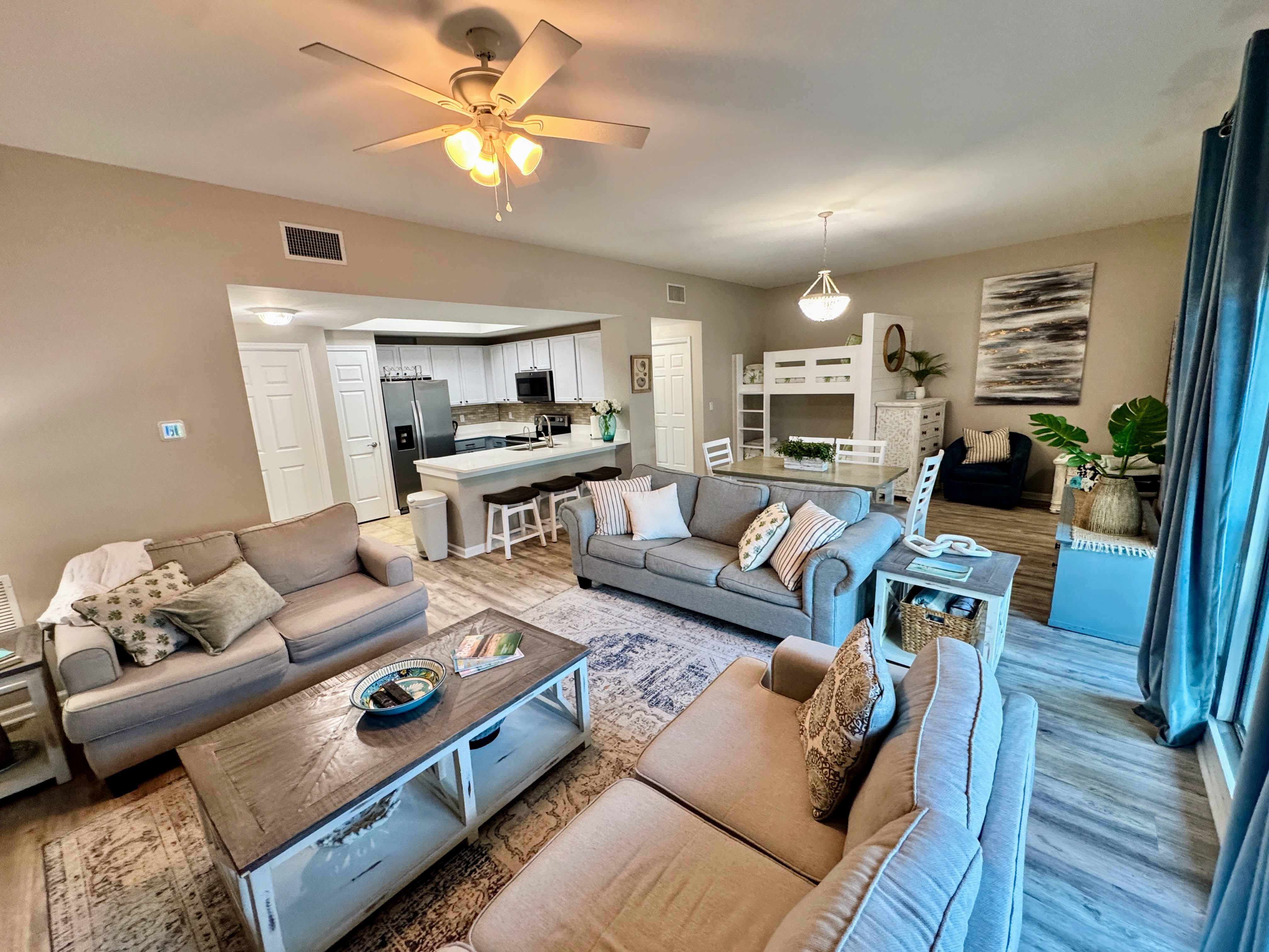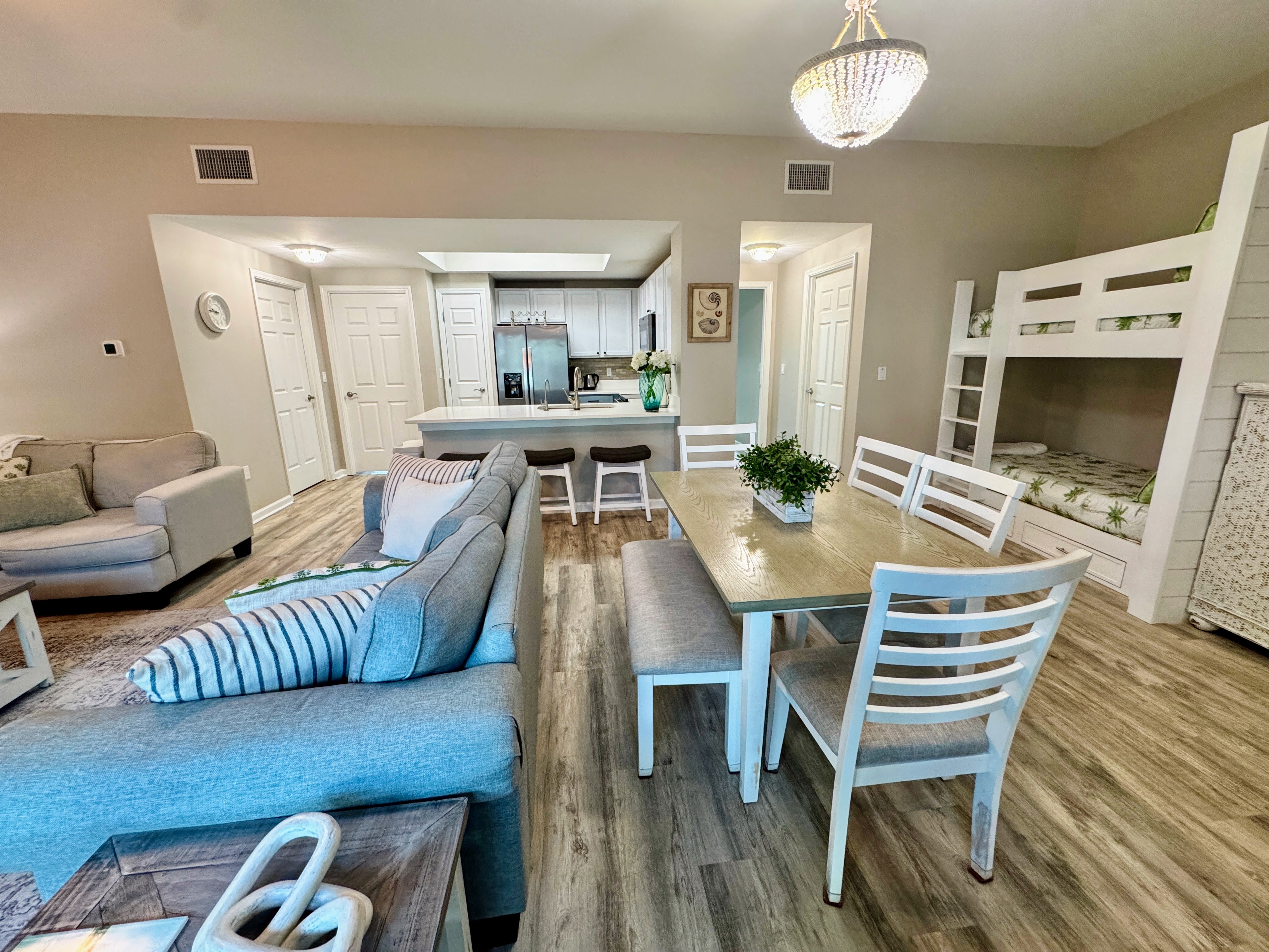 Seamless Indoor-Outdoor Coastal Living Double sliding glass doors flood the open-concept living area with natural light and lead straight to your furnished private patio overlooking the lagoon pool. Morning coffee with pool views or sunset cocktails — the choice is yours. Or if you like water, we have a new Reverse Osmosis system just for you! Spacious Living & Dining - Large sectional sofa and Smart TV for movie nights - Full-size pull-out sofa sleeper in the living room - Open dining area with table and chairs - Fun twin bunk nook built into the family room — a kid favorite! -Powered standing desk to check in on business Fully Equipped Kitchen Everything you need for quick breakfasts or seafood feasts: stainless appliances, Keurig + drip coffee maker, blender, toaster, cookware, bakeware, air fryer, and plenty of counter space. Sleeping Arrangements (Sleeps 8) - Primary Suite: King bed, standing desk, Smart TV, en-suite bath with tub/shower combo - Guest Bedroom: King bed, Smart TV, adjacent full bath with walk-in shower - Living Room: Full-size pull-out sofa sleeper - Family Room: Built-in twin-over-twin bunk beds - Full-size washer & dryer in the villa — perfect for longer stays or sandy beach towels Unbeatable Location & Resort Amenities You’re literally steps from the zero-entry lagoon pool with waterfalls, tropical island hot tub, heated seasonal pool, and children’s splash zone. Additional resort perks include: - State-of-the-art fitness center - Lighted tennis, basketball, and pickleball courts - Playground and charcoal grilling stations - Complimentary seasonal shuttle (March–October) to the beach and shopping The sugar-white sands and emerald waters of Destin’s public beach access are a .25 mile walk, a quick shuttle ride or 5-minute drive away. Henderson Beach State Park is just 3 minutes by car. Guest Access Entire private villa + all resort amenities with wristbands (included in resort fee). Check-in at the main lobby desk where you’ll receive parking passes, key cards, and amenity wristbands. Parking Two complimentary parking passes are included for the covered parking garage. During the off season (Nov 1-Feb 28), guest are allowed up to three parking passes. Important Resort Information: To make your stay better, The Palms of Destin offers a complimentary beach shuttle from March to October. *Some amenities may have reduced hours or seasonal availability Oct–Feb. Hours are posted on-site and subject to change. Other Things to Note: - Ground-floor — no stairs or elevator needed - Sorry, no pets and no smoking/vaping - resort rules - Travel insurance is recommended - Professionally cleaned and inspected before each stay Book Emerald Haven Poolside Villa #10 today and treat your group to the easiest, most relaxing Destin vacation imaginable. The pool is calling!